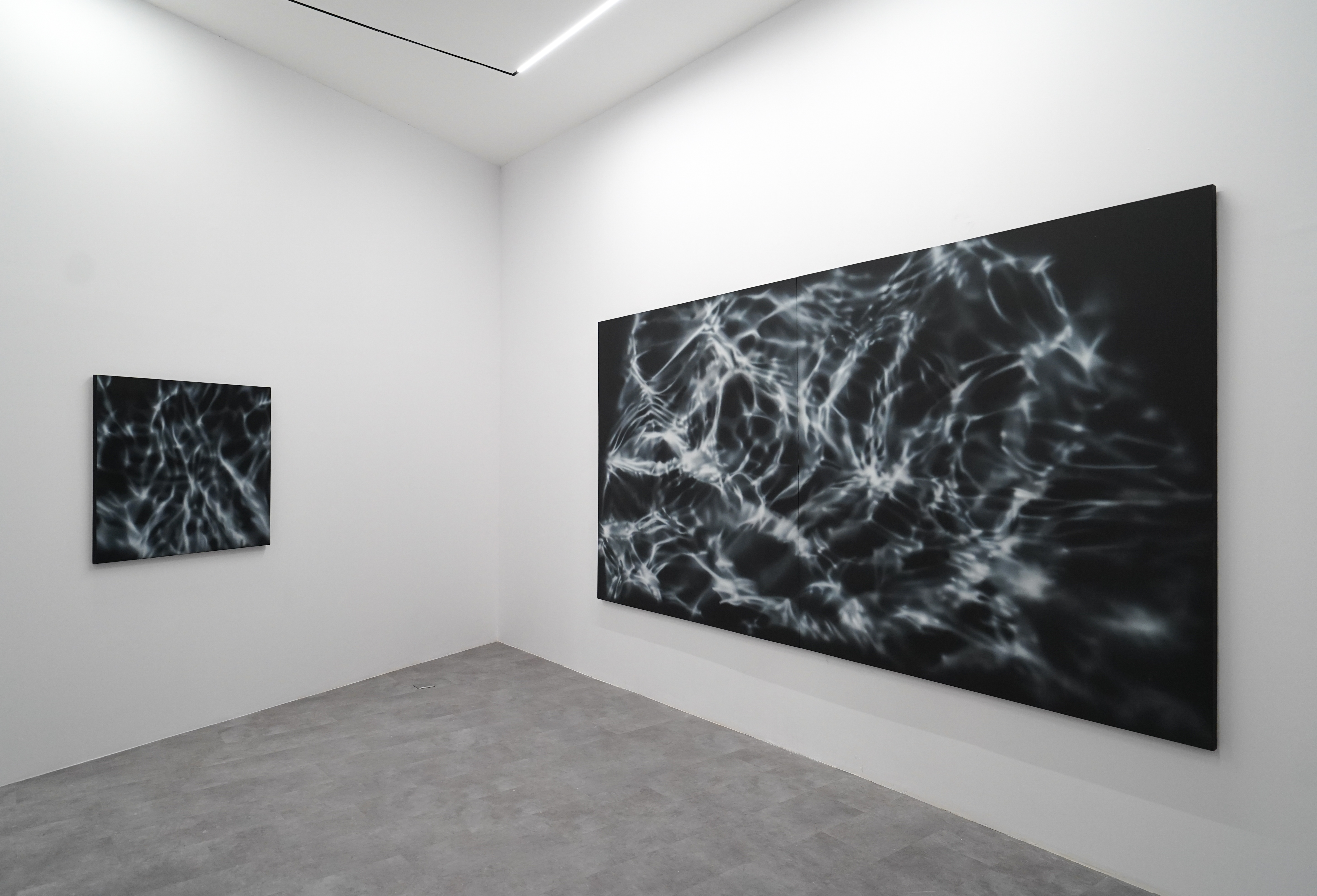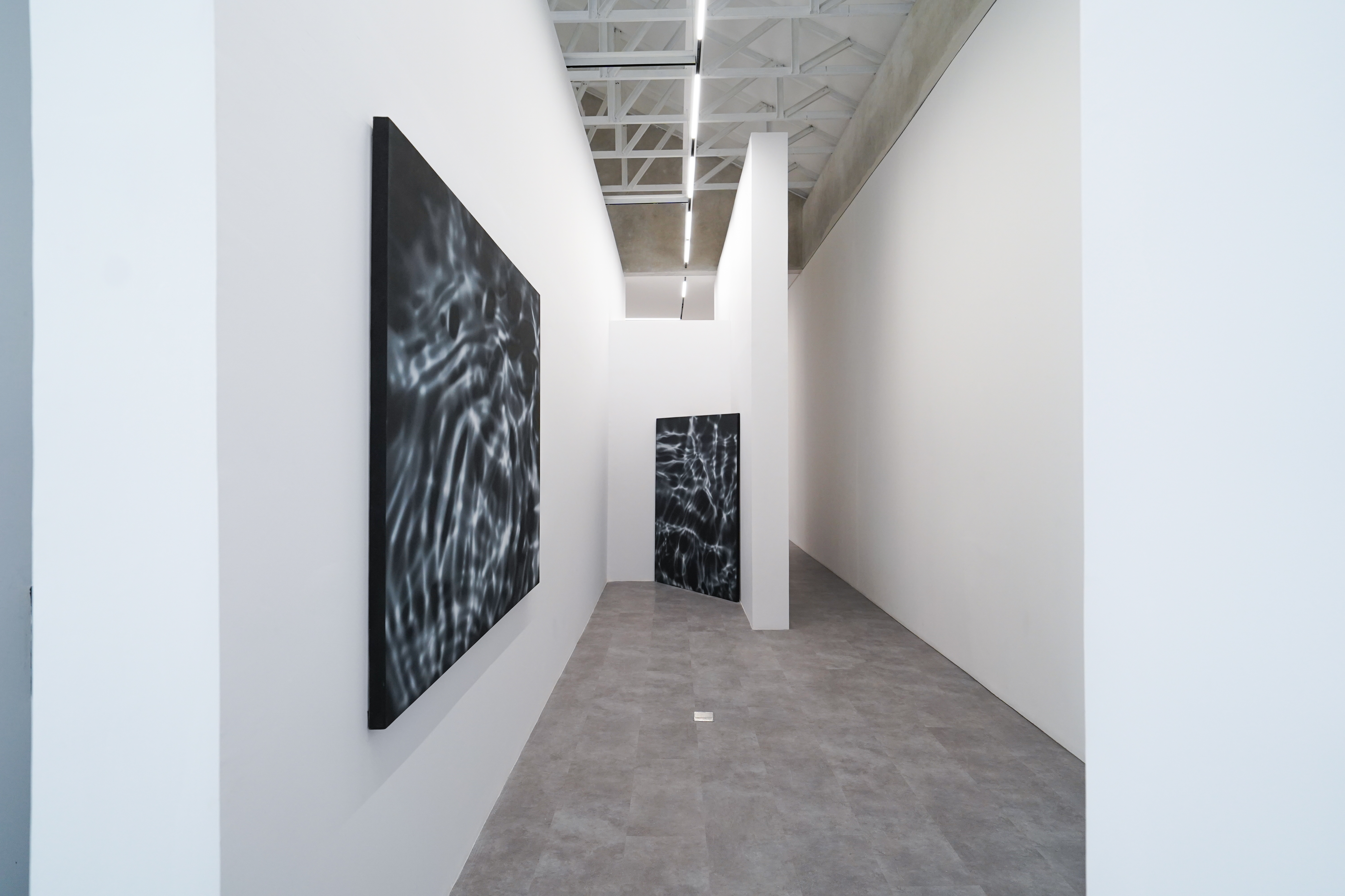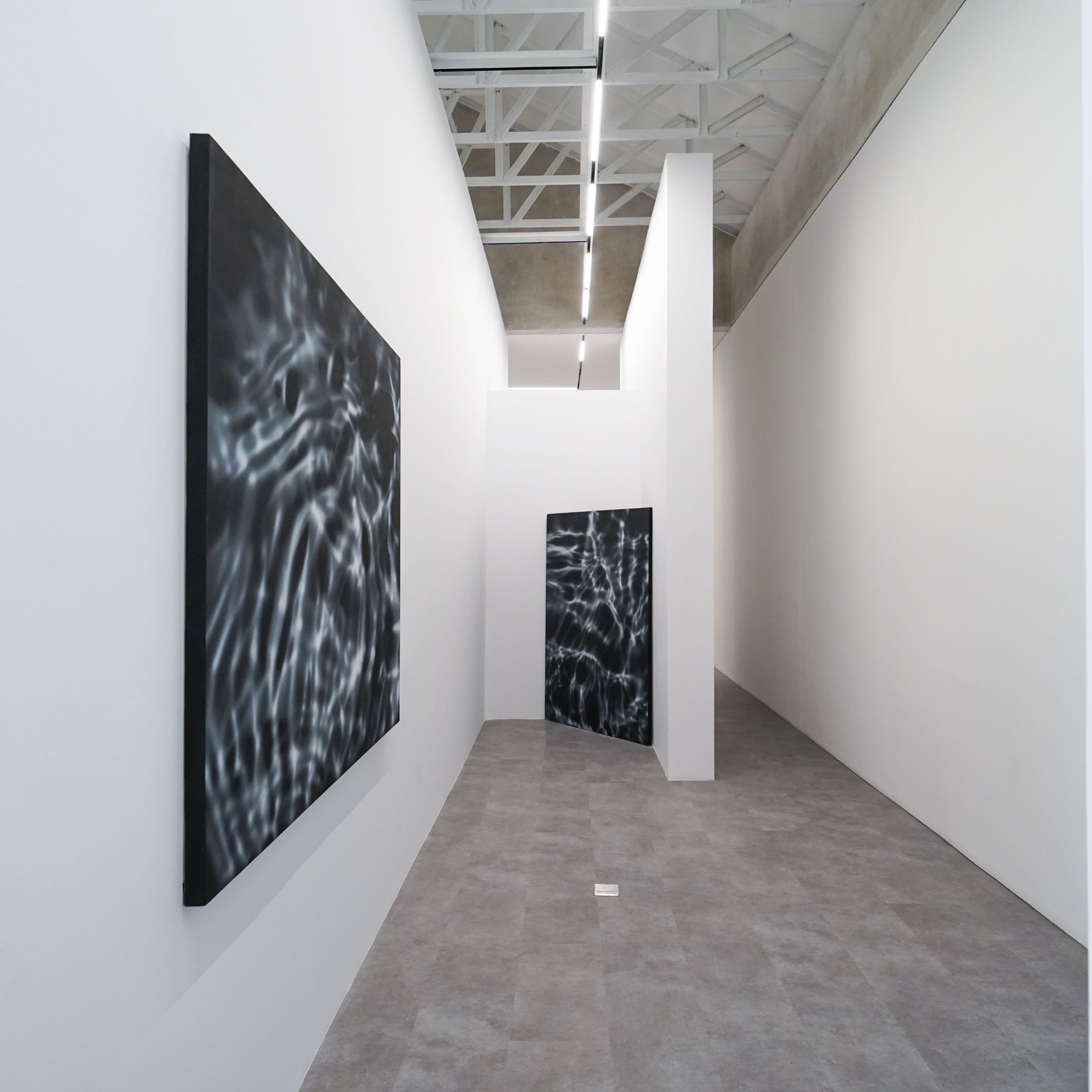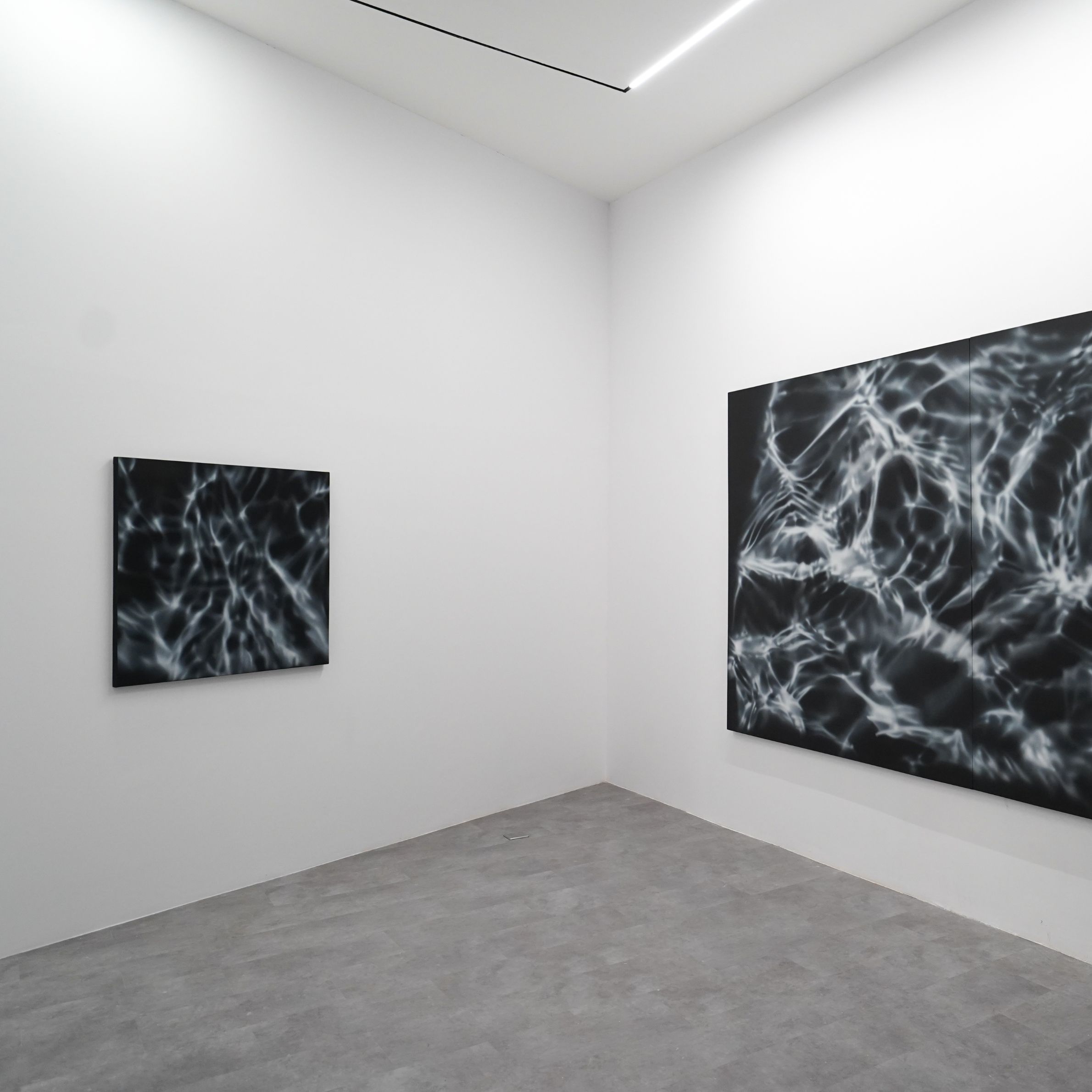 Priyoaji's fourth solo exhibition, The Stillness of Becoming, is rooted in a philosophical paradox: how can becoming contain stillness? As he continues the attempt to pause a flux, to find a still point within it. Priyoaji extends his observations of light and its interactions with the surrounding environment. While his previous series explored the play of light in natural settings, this time he turns to its encounter with man-made elements such as mirrors and rippling water. He places a mirror at the bottom of an aquarium filled with clear water and sets the water in motion. Light is then directed at the mirror, reflecting the rippling shadows that appear on the surface. Through this series, Priyoaji examines how water, though seemingly still, bends light in ways that give it both shape and motion, transforming how we perceive the object and the world around it. This body of work continues Priyoaji's ongoing exploration of how visual reality is merely a reflection of light upon surrounding objects. Resulting in monochromatic paintings, Priyoaji's works suggest that stillness is never absolute, but a pause within movement. The Stillness of Becoming gestures toward the dualities inherent in perception: light and dark, movement and stillness, the tangible and the intangible. Ultimately, the impermanence of light and the constant transformation of both natural and constructed environments remind us of the transient nature of existence, how seeing is shaped by time.
