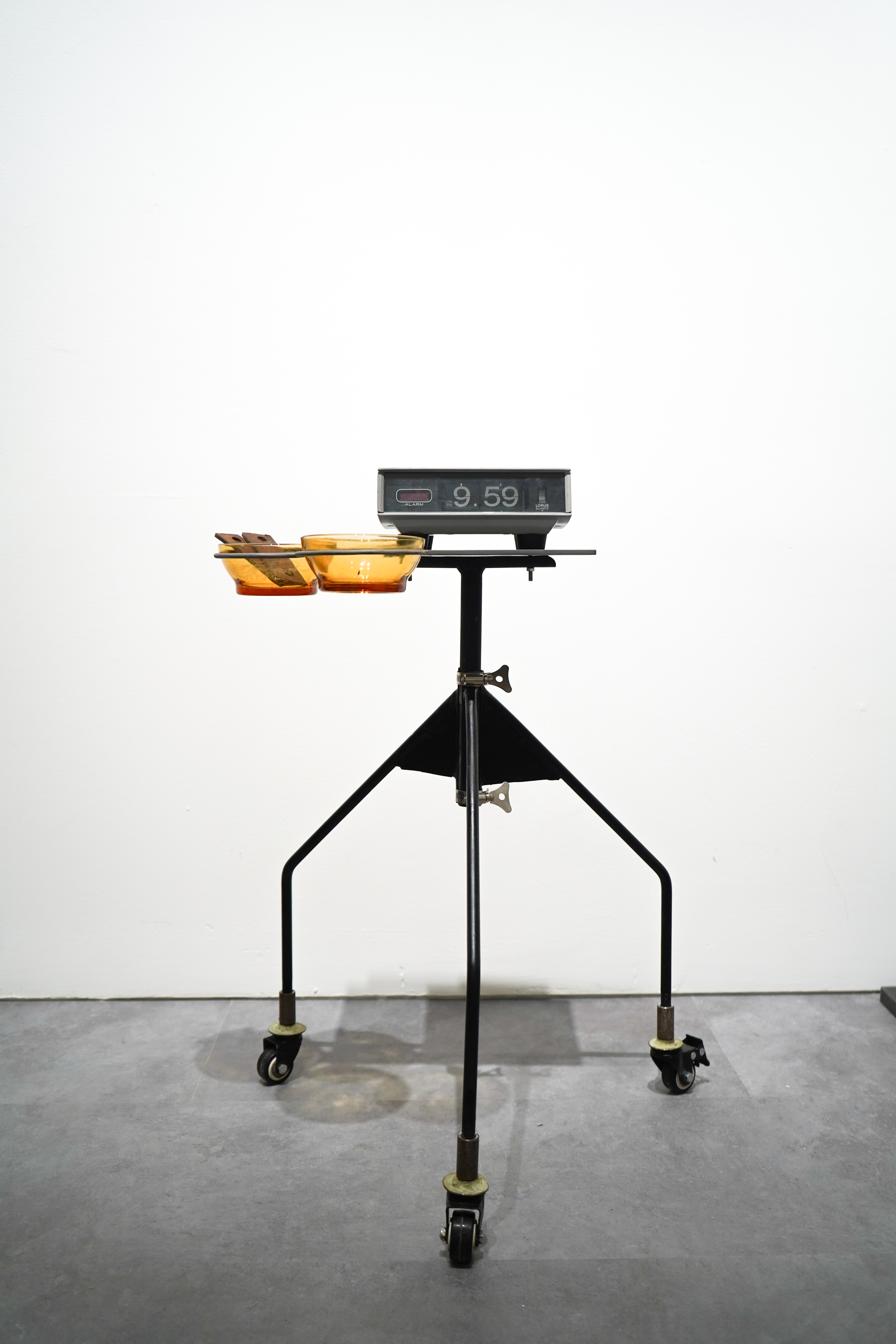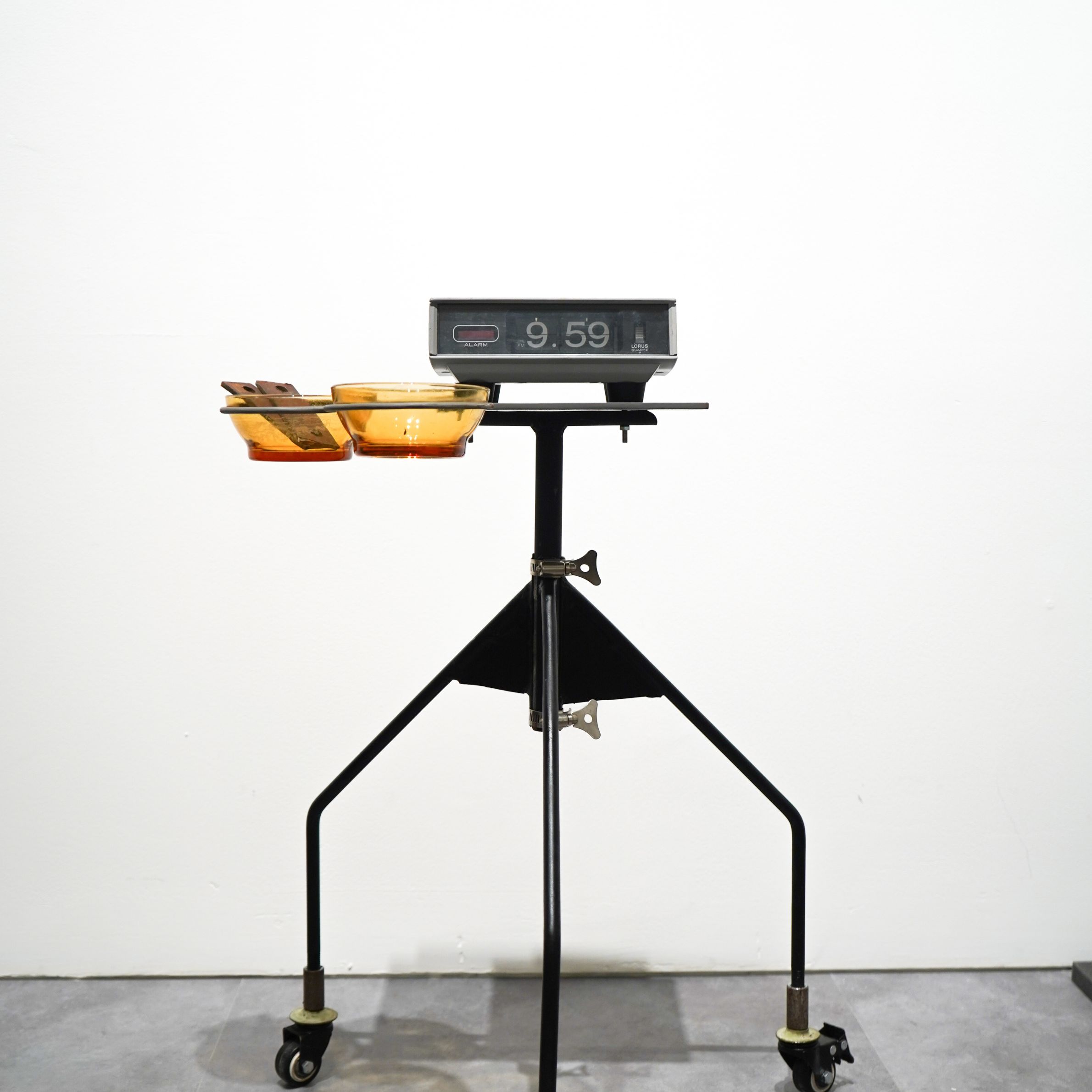 2025, flip clock, glass bowls, iron pieces, water, metal stand, 69 x 49 x 29 cm