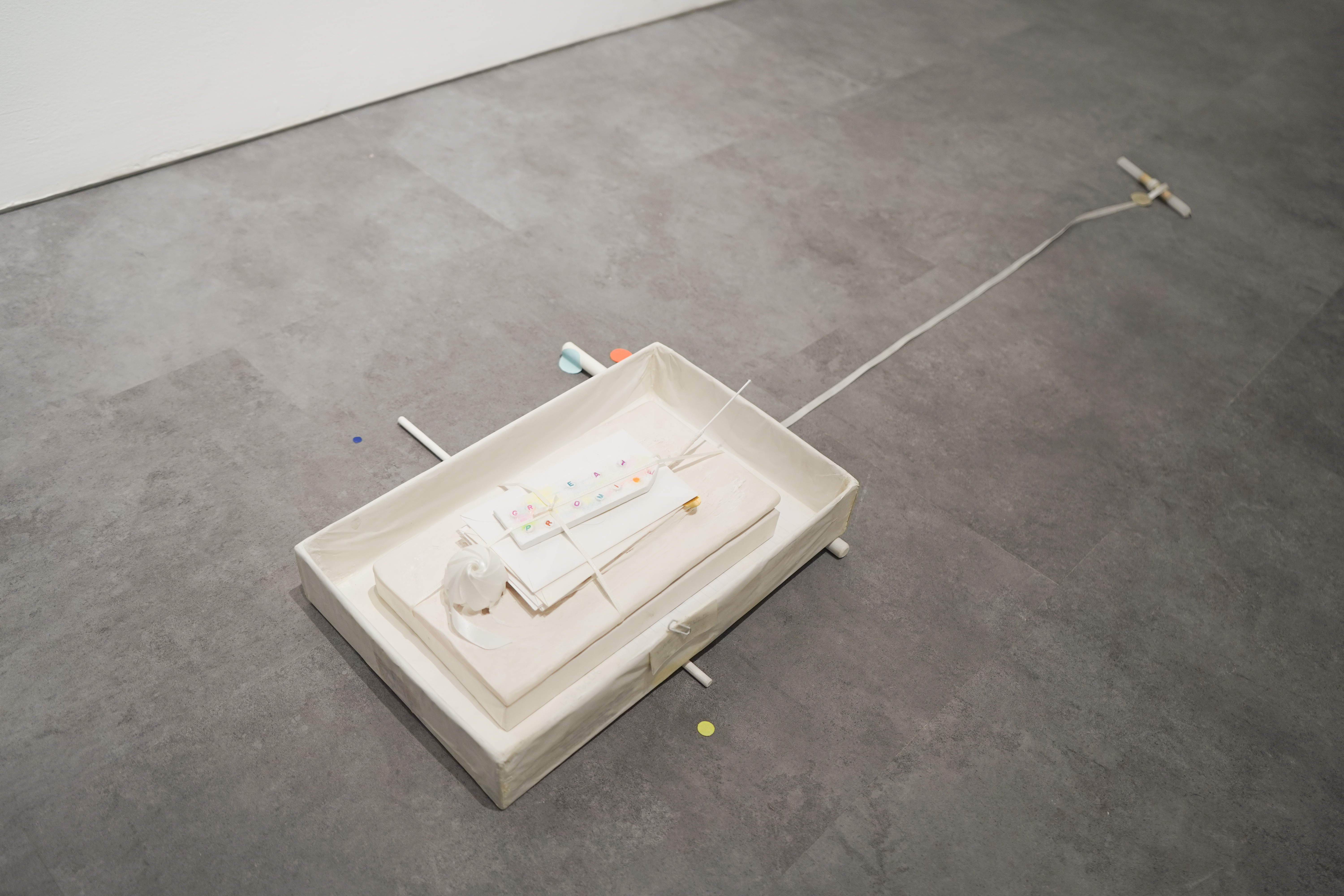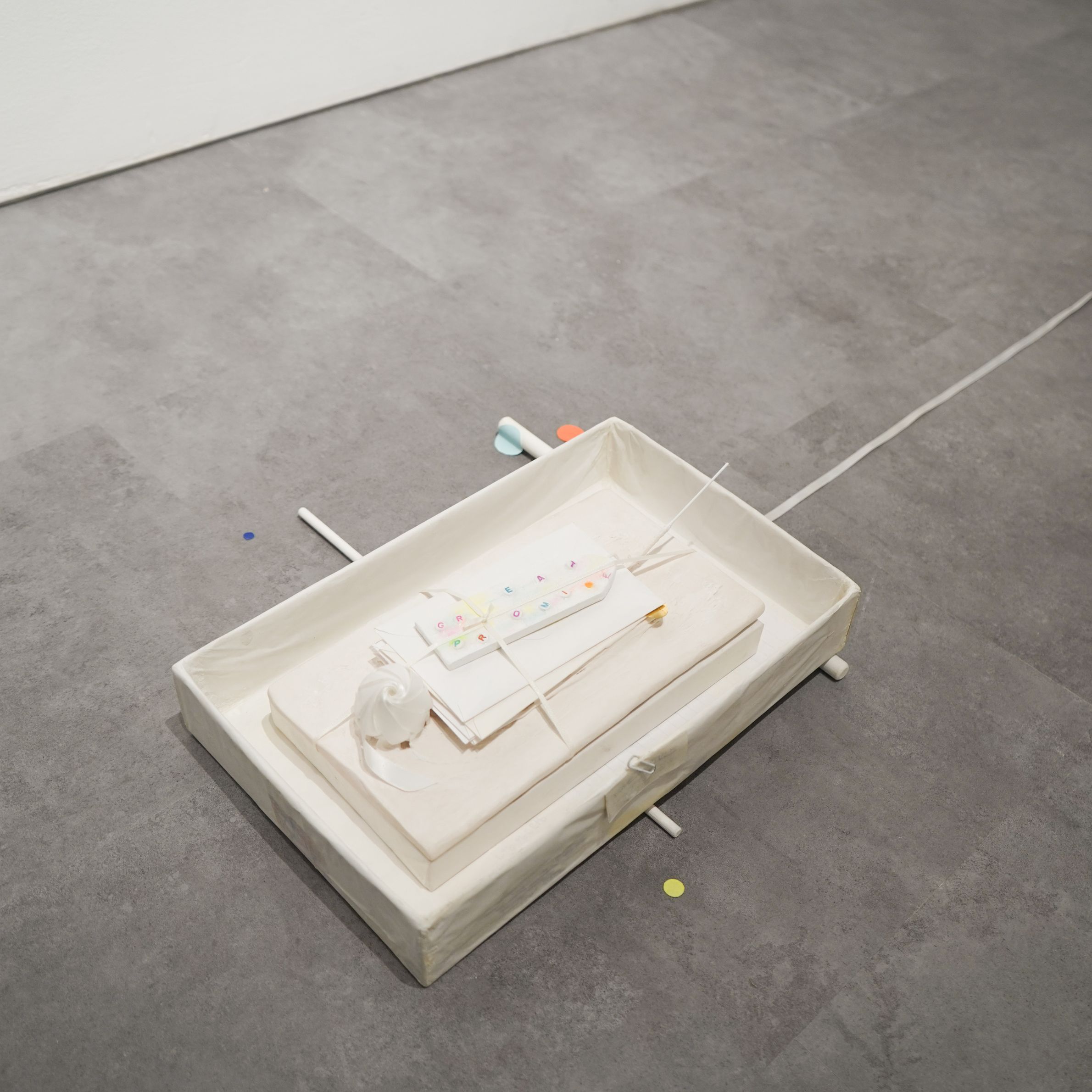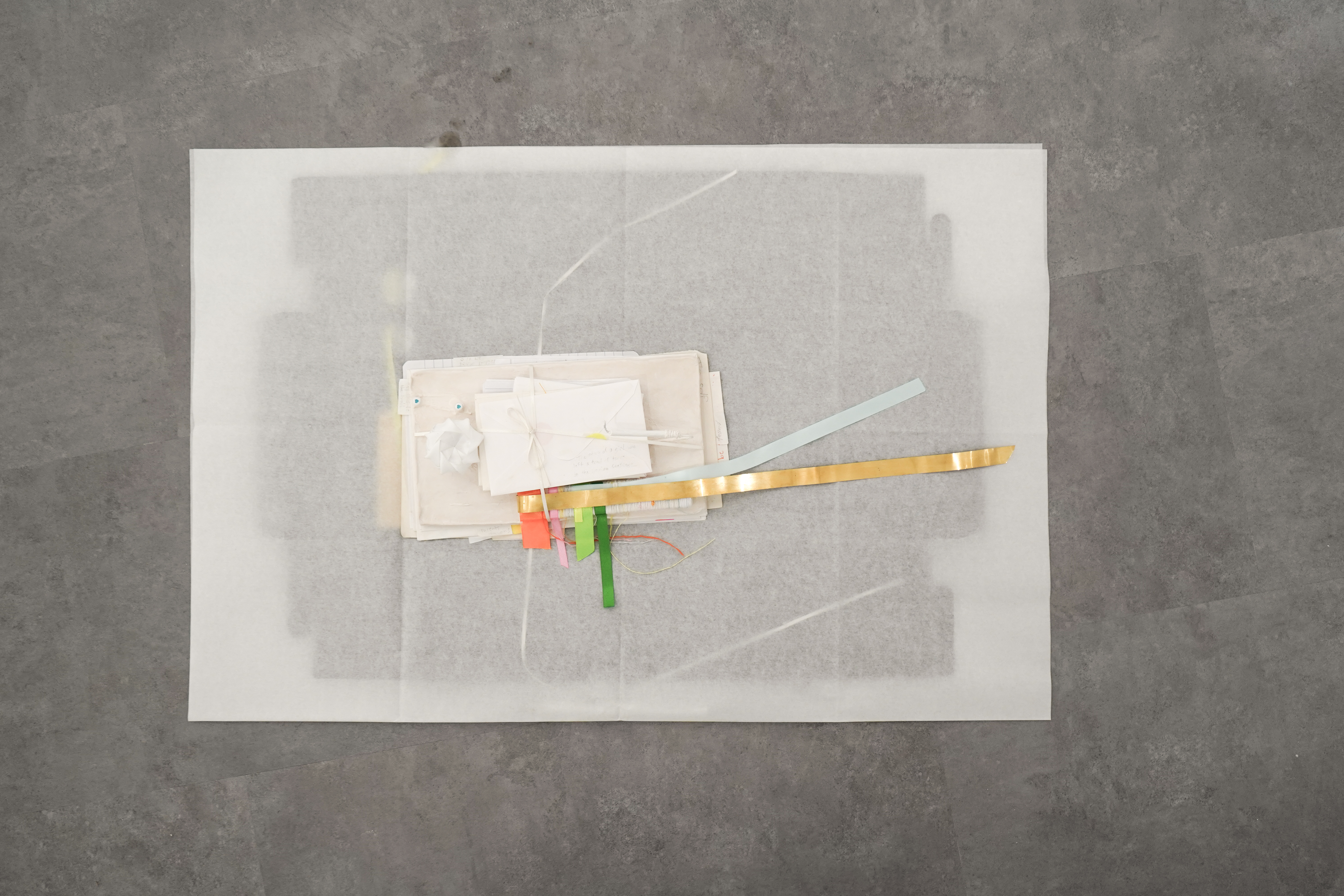 2025, jesmonite, paper, ribbons, threads, brass, candles, beads, box, wax paper, 51 x 77 cm
