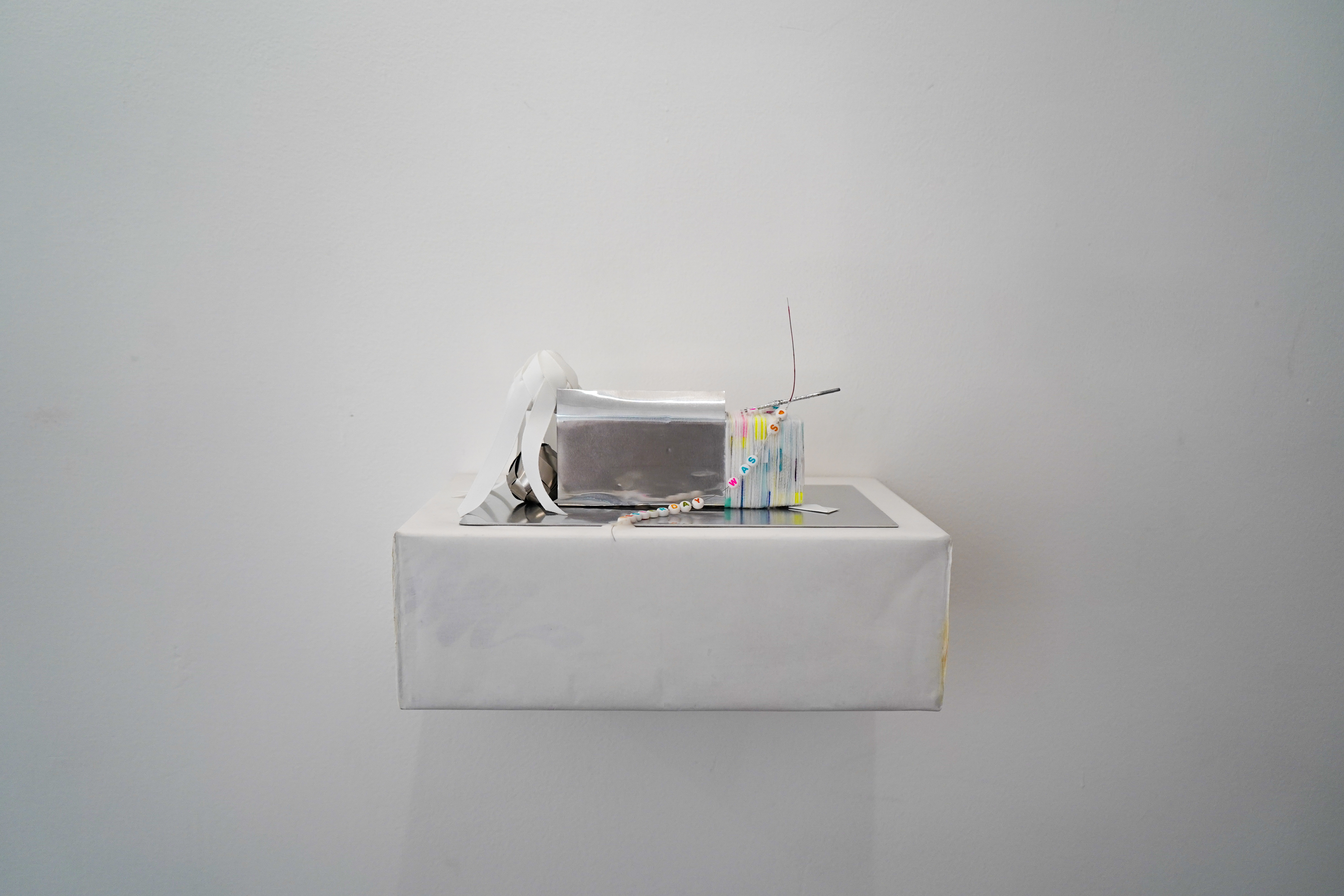 2025, ribbons, aluminium sheets, aluminium plates, threads, beads, guitar strings, box, wax paper, 25 x 30 x 20 cm