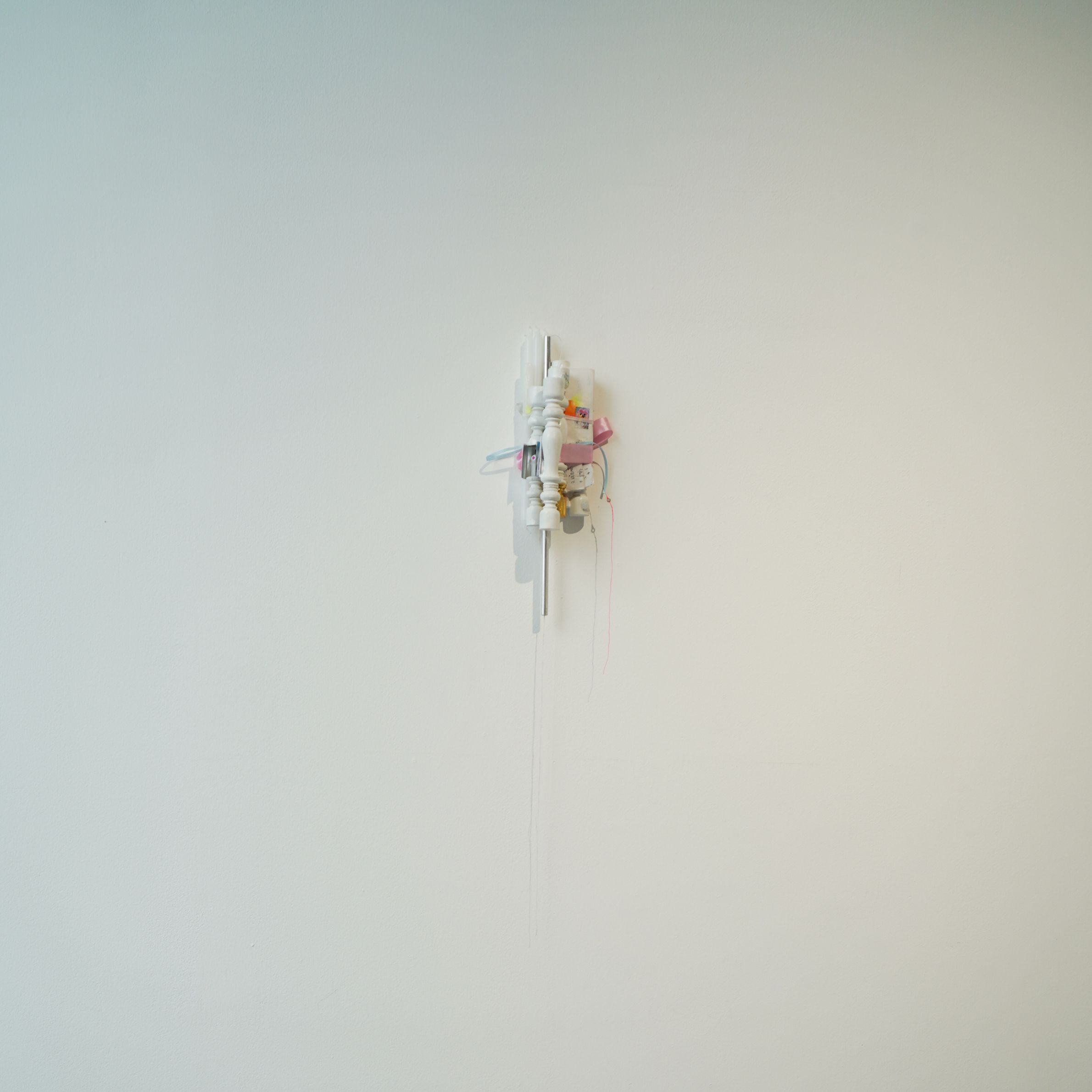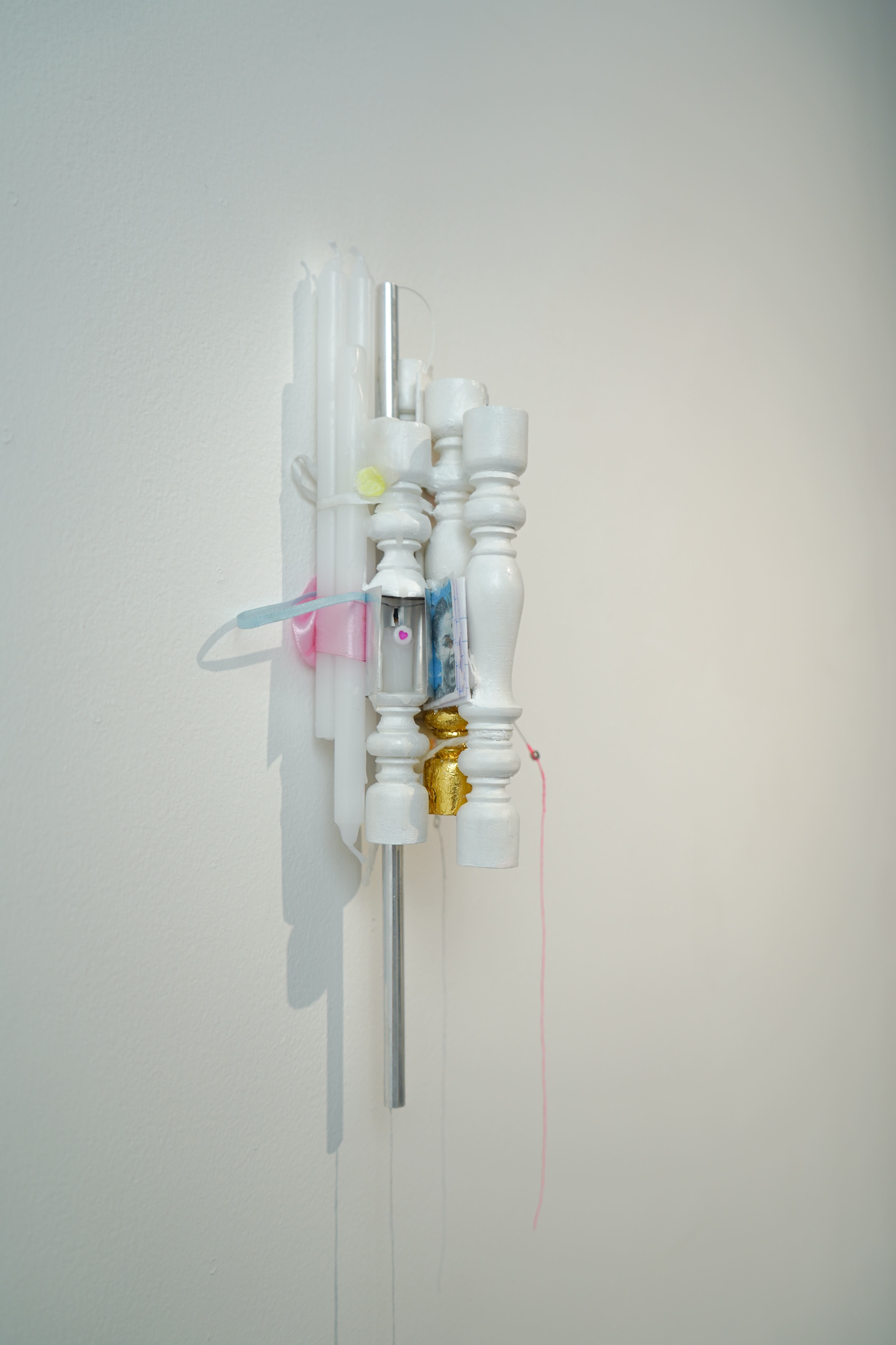2025, woods, aluminium tubes, threads, ribbons, candles, paper, found object, guitar string, gold leaf, 67 x 9 x 8.5 cm (without excess ribbon), 67 x 13 x 8.5 cm (with excess ribbon)
