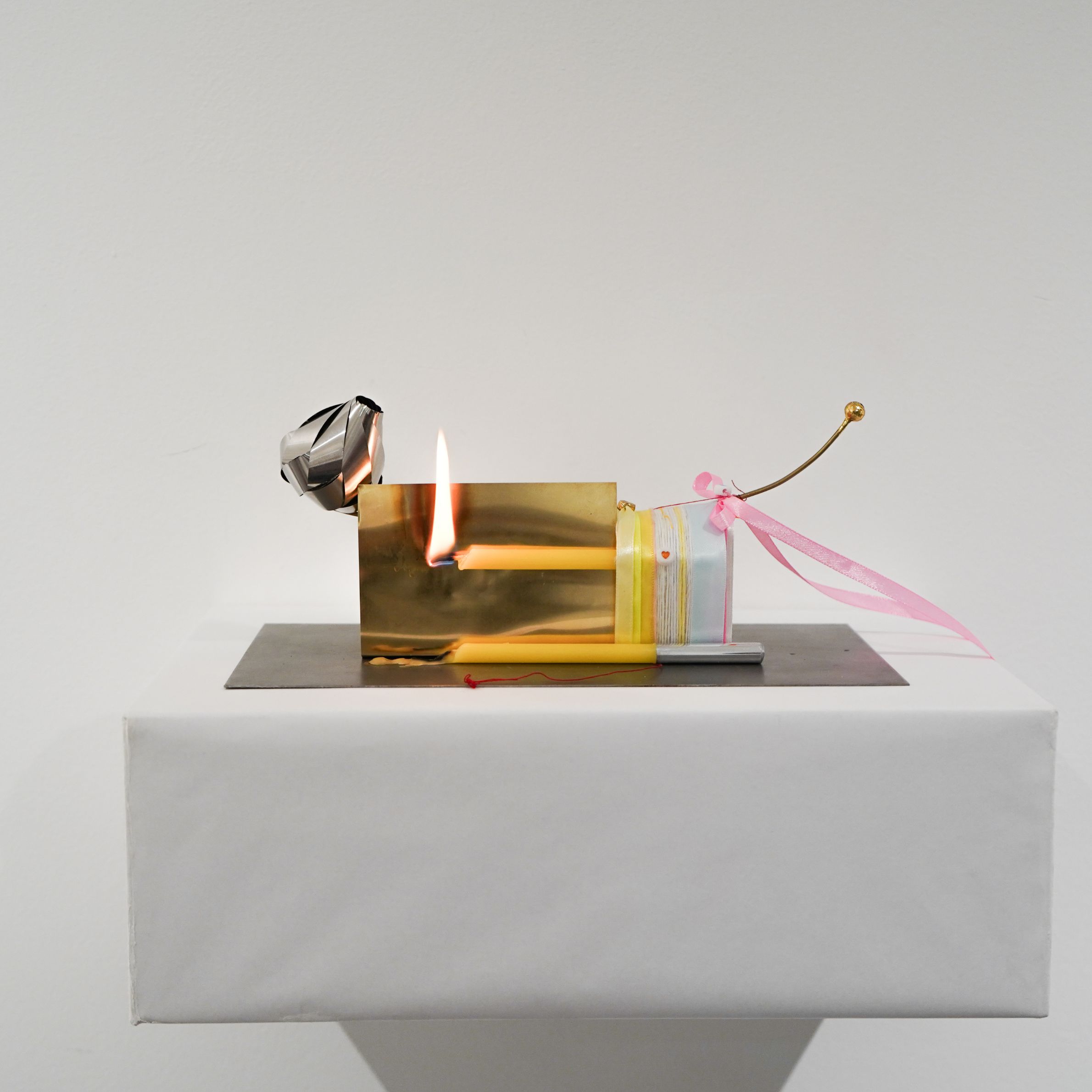 2025, brass, aluminium, corten plate, ribbons, threads, candles, beads, box, wax paper, 22 x 33 x 23 cm