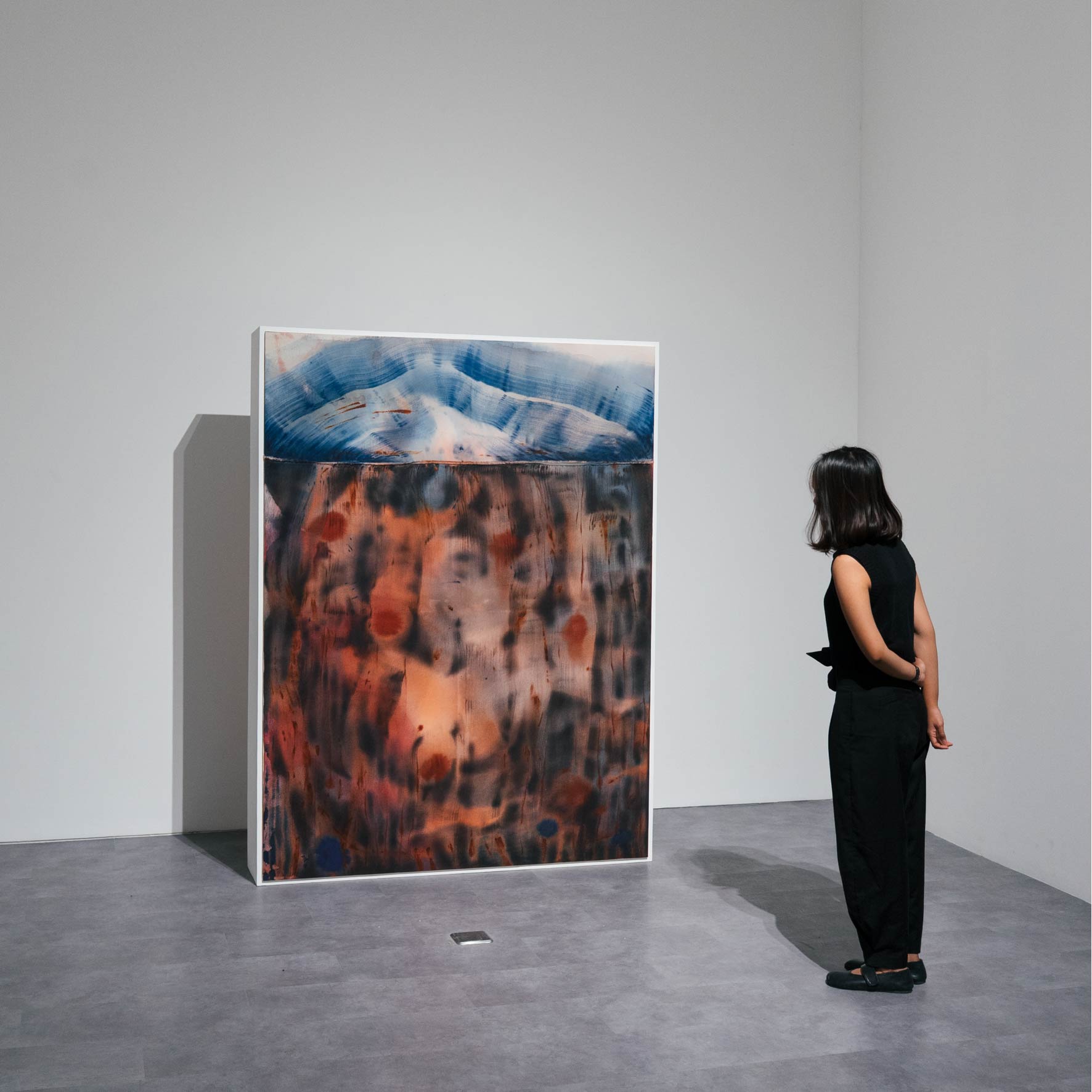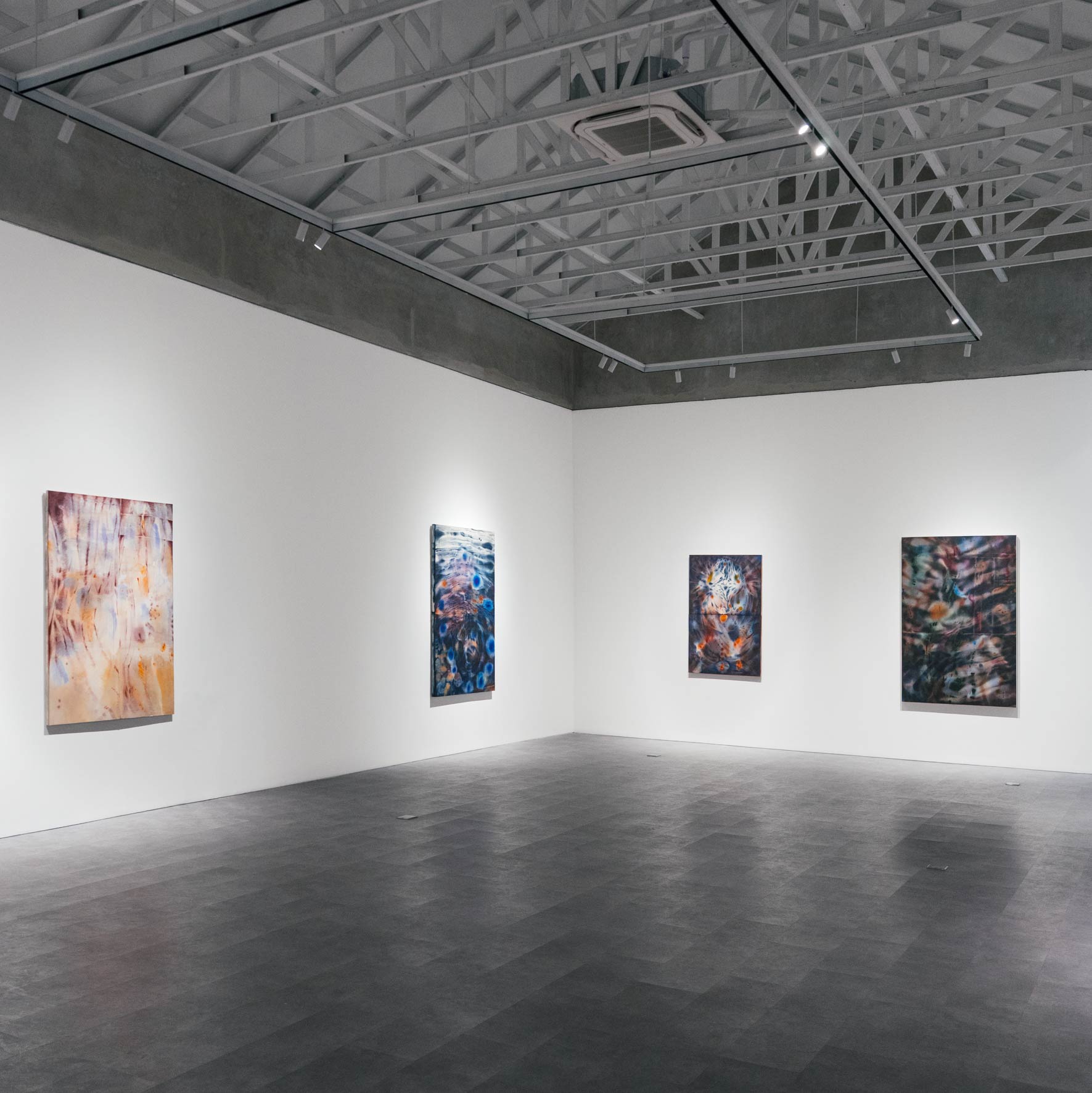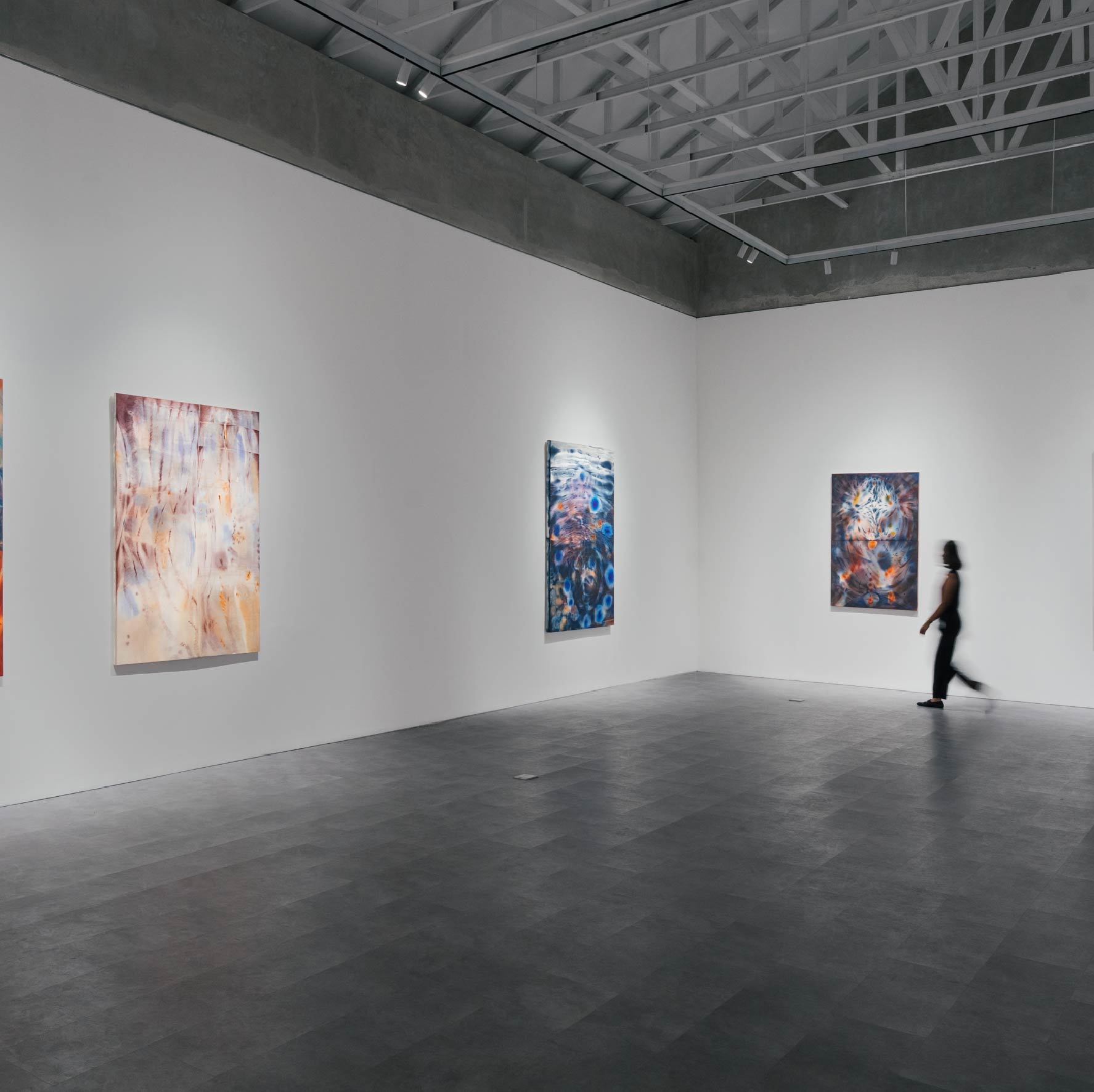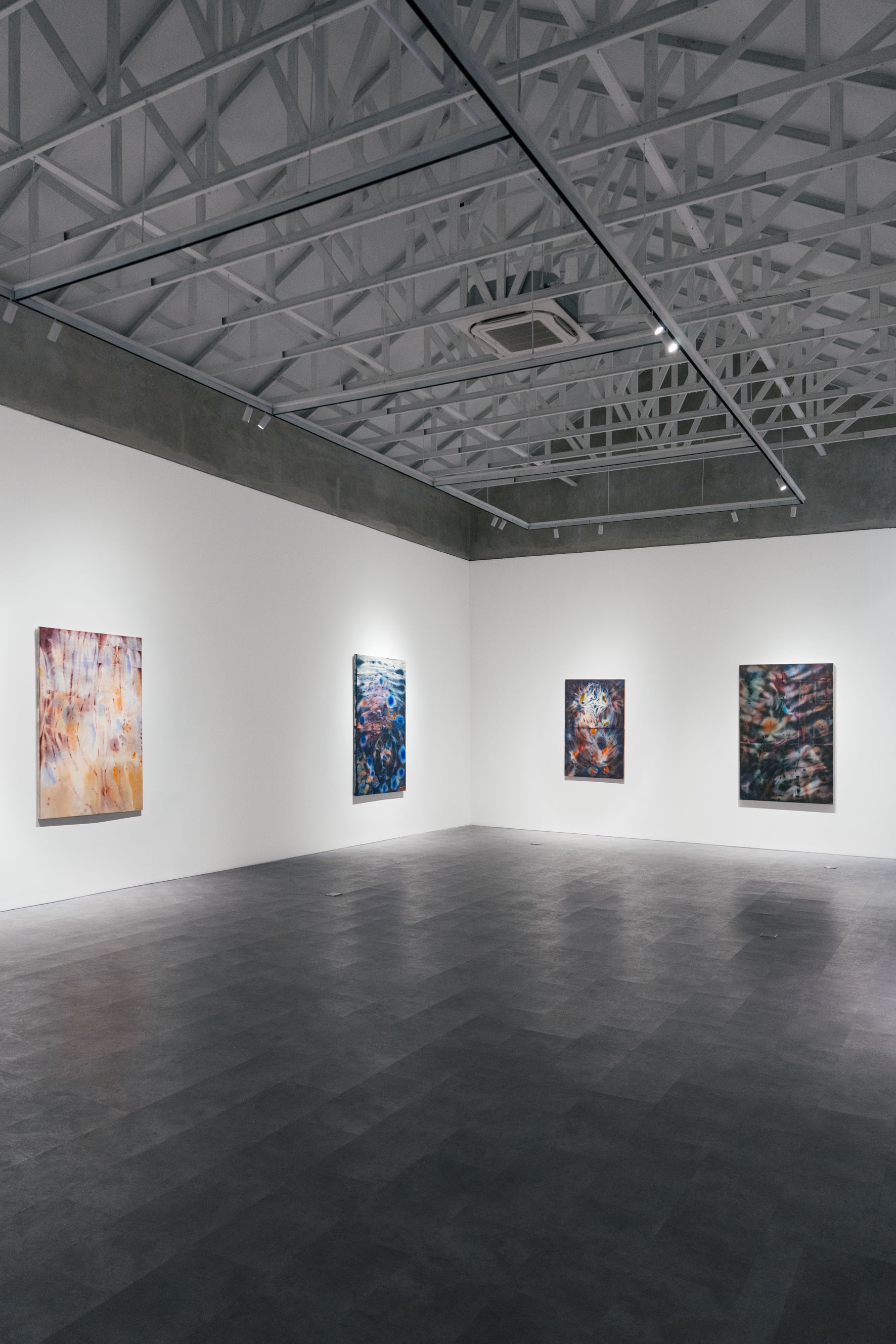 Doorway carries the sensitivity to the nuances of the body, and the inward process of attuning to its shifting sensations. These notions about the body emerged more fully after Ceniga Prado's relocation to Southeast Asia. She employs a limited palette, tonally expanded through the use of transparency. The interplay between opacity and translucence suggests shadow and light more than colour itself, ultimately creating space and depth. The gradual tonal shifts evoke a sense of change and emphasize the subtle movements between shades. In this way, the rhythm and vitality of her marks are brought to the forefront. In her new body of works, Ceniga Prado also stitches together pieces of canvas fragments, a technique that resembles piecing together fragments of understanding until a full image is seen. This process mirrors the ongoing journey of learning about our ever-changing internal bodies. In tracing the body's quiet rhythms, her paintings gesture toward a language beyond words, one that unfolds by looking into the spaces in between.