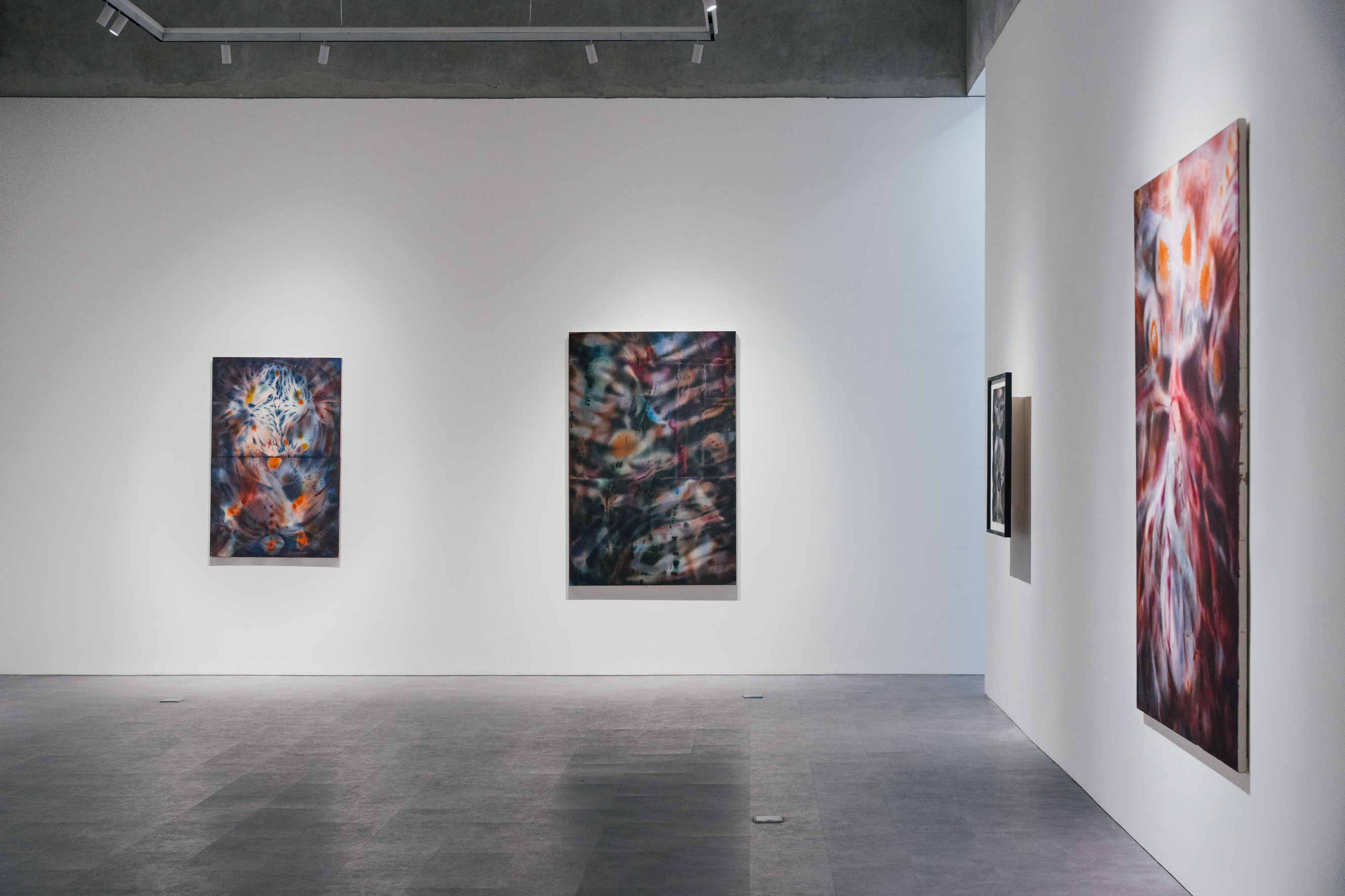Carmen Ceniga Prado's practice explores her own body and its spectrums through abstraction, particularly the in-between feelings and internal sensations that arise before they are categorized by the body and mind as emotional or physical. Here, abstraction is used to depict the formless and visceral, offering an entry point into an embodied space. Ceniga Prado's past engagement with wood carving reflects an investment in materiality and process. The tactile, labour-intensive nature of carving provcolour grounding physicality; however, it also imposed formal constraints when attempting to convey states of flux and indeterminacy. As she delves deeper into her own body, following a diagnosis of chronic pain, painting or mark-making becomes a way to access and express bodily presence and movements. It raises questions such as: What shape does a sigh have? Painting becomes a tool for accessing the liminal space between emotions and physical sensations, embracing their impermanence and transformations.