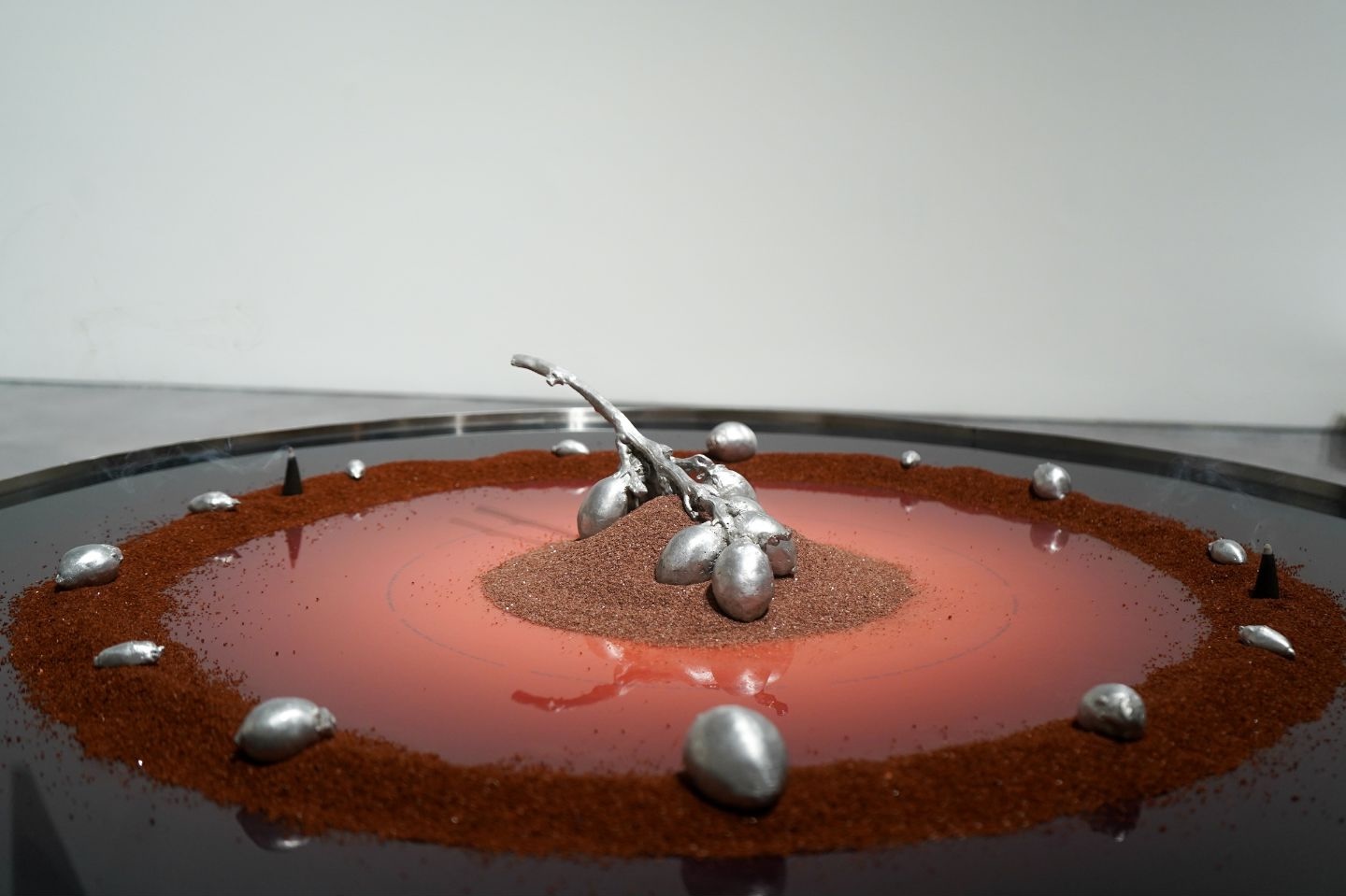 Betel nut is not simply a recurring motif but the central material and symbolic axis of Natalie's new body of work, one of the most charged symbols running through her practice. Throughout the exhibition, betel nut returns insistently, binding together questions of the body, feminist kinship and postcolonial condition in Thailand. Across Southeast Asia, betel chewing has long operated as a social and ceremonial medium; the act of chewing betel nut together functions as a gesture of hospitality to welcome guests into the household or offered as gifts in weddings or rituals, but also as a form of mild stimulation that sends a subtle chill through the body, a sensation that cuts through the stillness of midday. From the late 19th century, during the reign of King Rama V, the practice was gradually displaced by imported ideals of modernity bound up with hygiene and civility, culminating in state-led campaigns in 1940s Thailand to suppress it. Betel stains the teeth, reddens the saliva, trains the mouth, and seeps into the body. Long condemned as vulgar or backward, it undergoes an alchemy here, recast in silver aluminium and given weight in what becomes Natalie's own rituals.