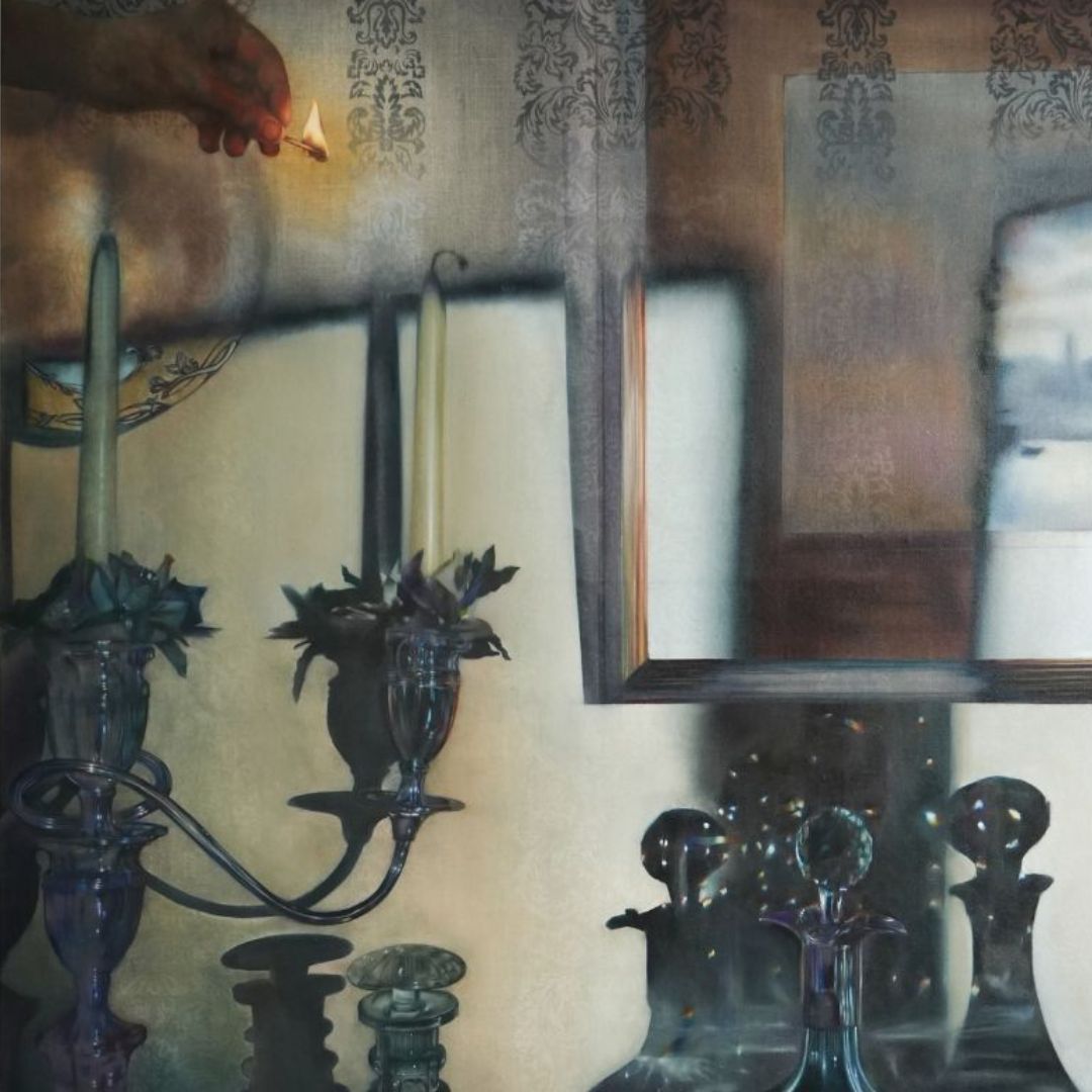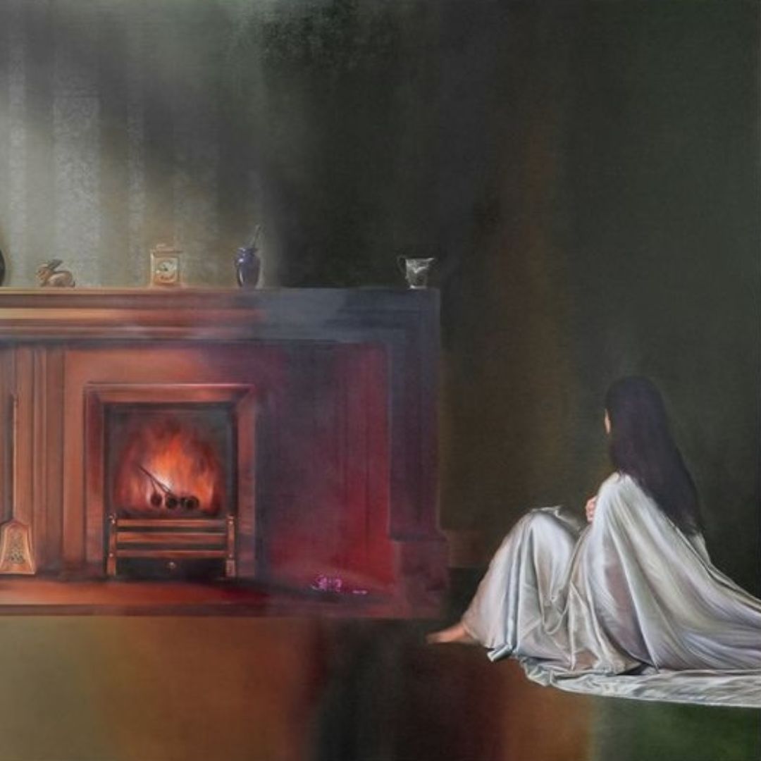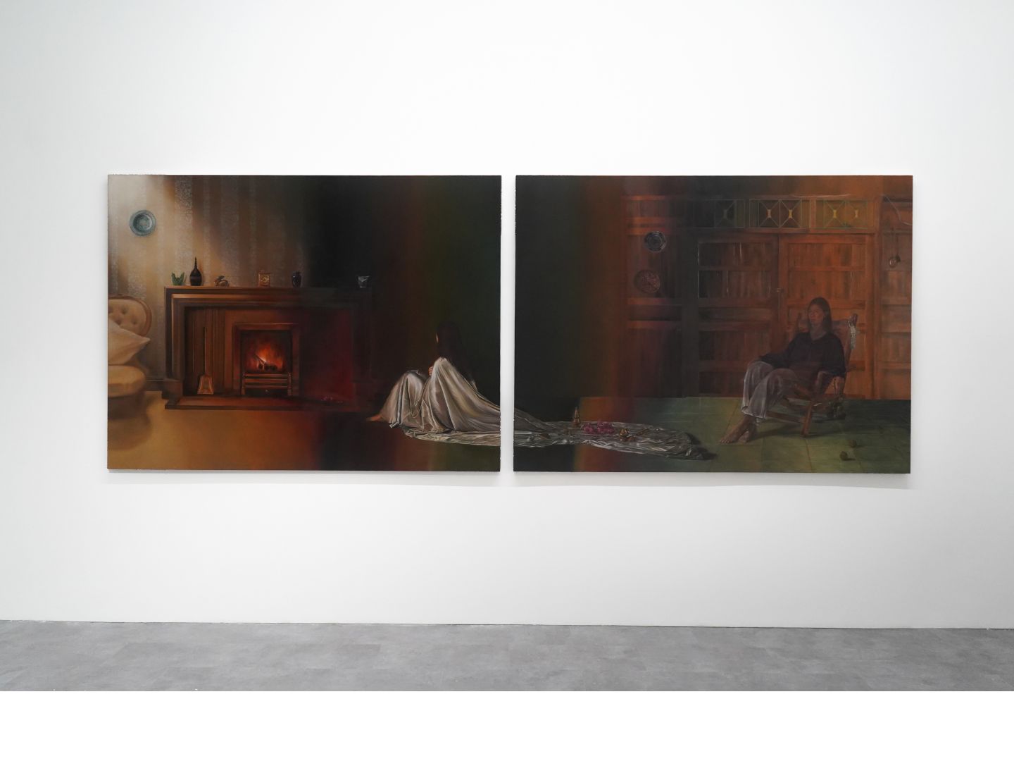 Upon entering the space, one is confronted by a large-scale diptych, titled I bloomed where cut, I burned where placed, not only in their dimensions, but in their perspective. The central figure is the artist herself, situated within two of the most intimate environments of her childhood: her maternal grandparents' home in Hua Hin, and her paternal grandparents' home in Bristol. In contrast to Natalie's earlier works, which often present fragmented bodies—hands, backs, partial gestures—embedded within tightly composed, contextless scenes, these paintings, for the first time, open up the perspective, allowing us to see more of what has always been there. In one painting, Natalie sits in her grandfather's wooden armchair, her body rendered so faint it nearly disappears. In the other, she turns her back to the viewer, facing a fireplace burning betel nuts. A soft piece of silk drapes across her body, extending into the adjacent canvas, binding together two places of starkly different domestic furnishings and perhaps rituals, both of which she calls “home,” despite their geographical distance. Yet it is not only Natalie who is fading, both of these spaces have already vanished or are on the verge of disappearing.