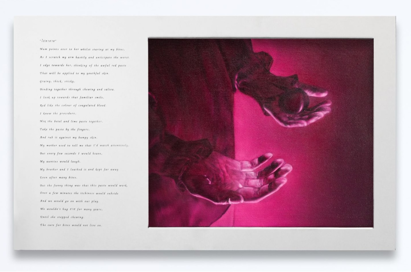 The exhibition opens with this very first time. Nestled to the left of the entrance, Cure for Bites is a small poem–painting diptych that begins with the phrase “ไปหายาย” (“go see Grandma”), a reminder her mother would repeat every now and then. Her reluctance had its reason. For those unfamiliar with betel chewing, the mixture of betel leaf, areca nut, and lime paste, combined with saliva, would create a chemical reaction that produces a vivid red liquid in the mouth. Through the astonished eyes of a child, this pungent, seemingly repulsive substance was applied to her skin as a remedy for mosquito bites and unexpectedly, it worked. What was once a memory of discomfort has since softened into tenderness.