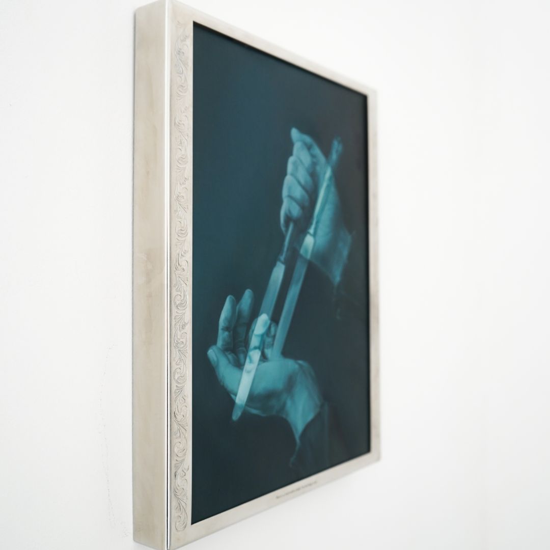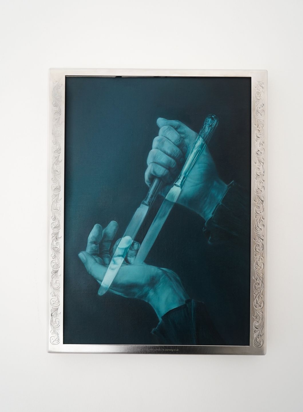 2026, oil on canvas and engraved stainless steel frame, 34.5 x 60 x 5 cm (framed)