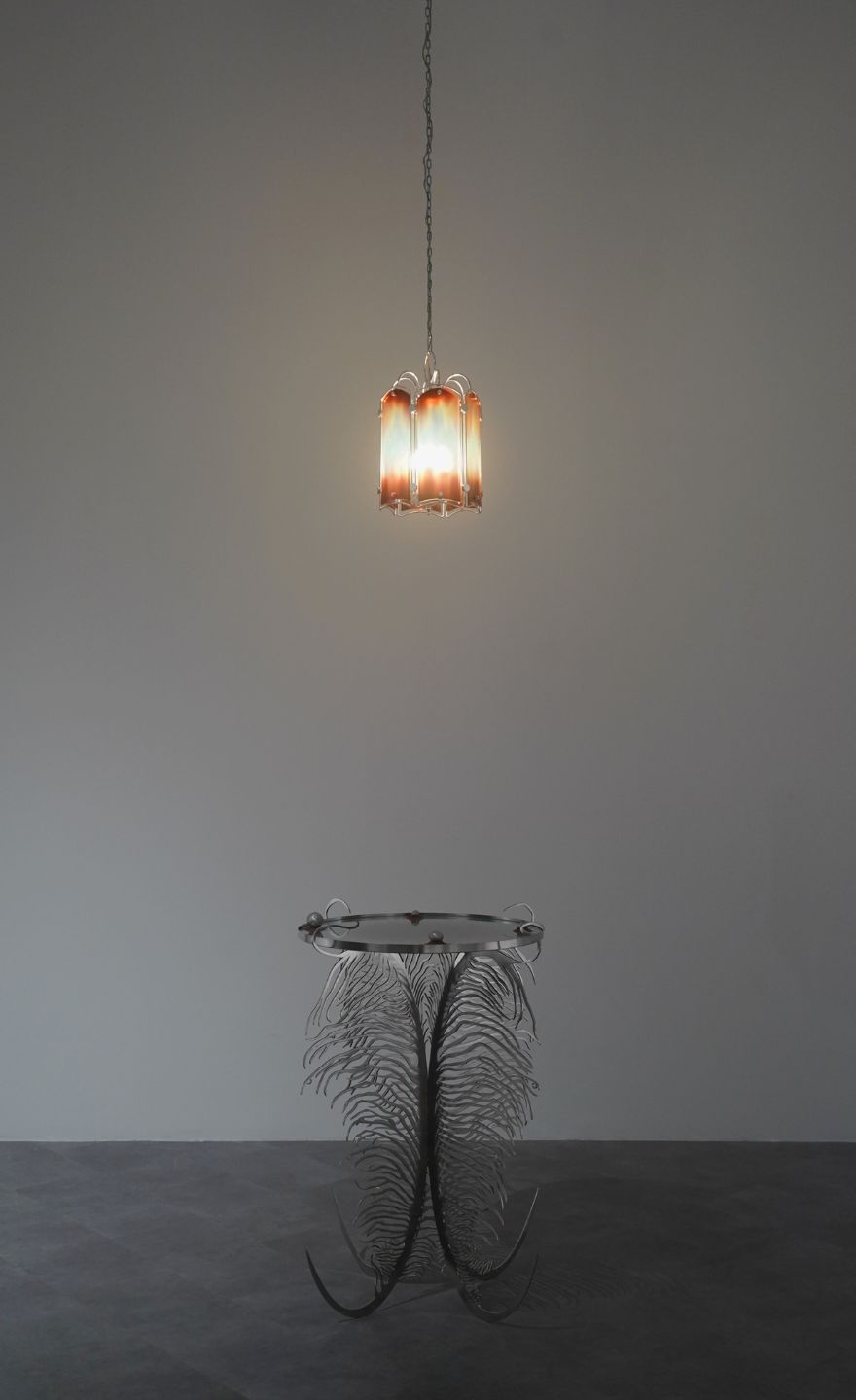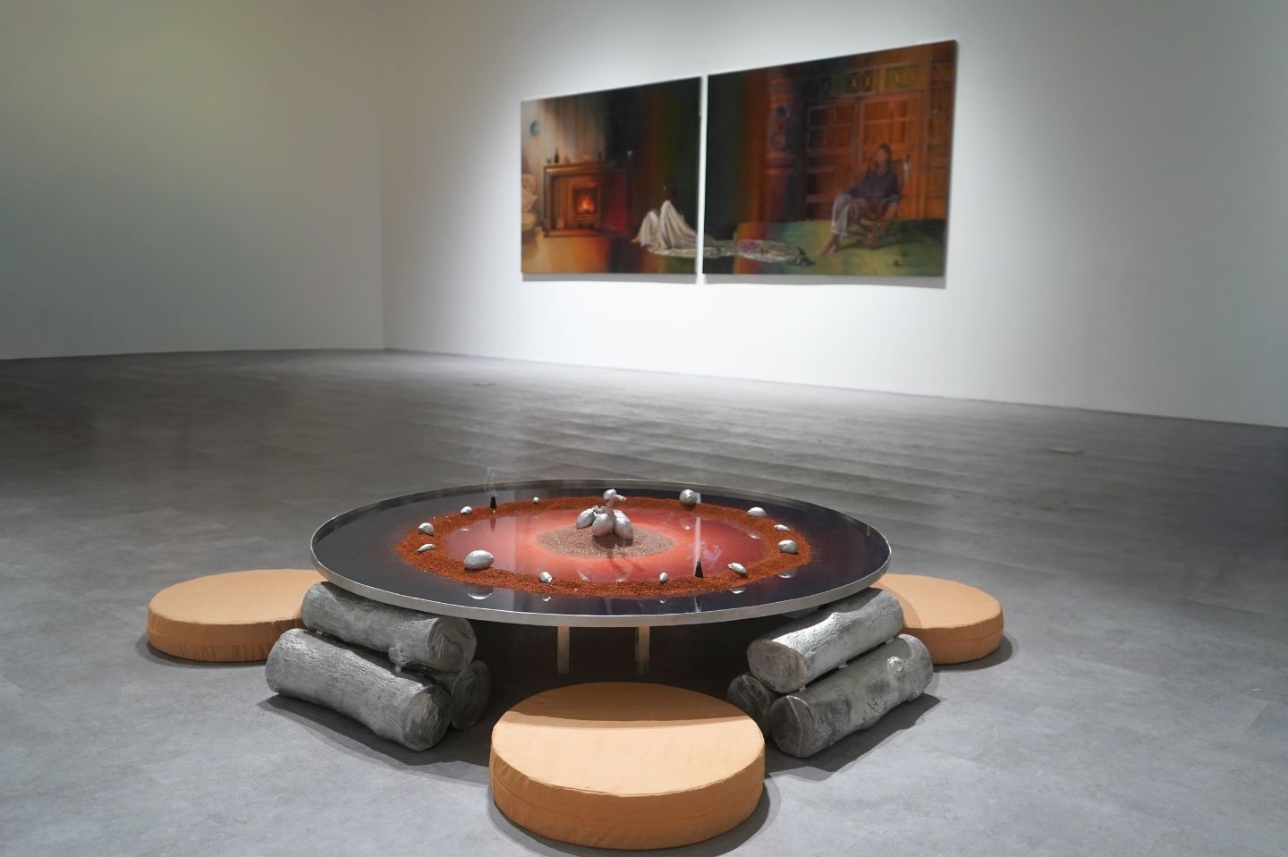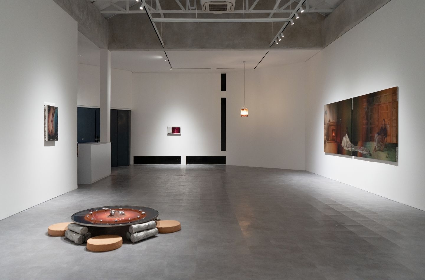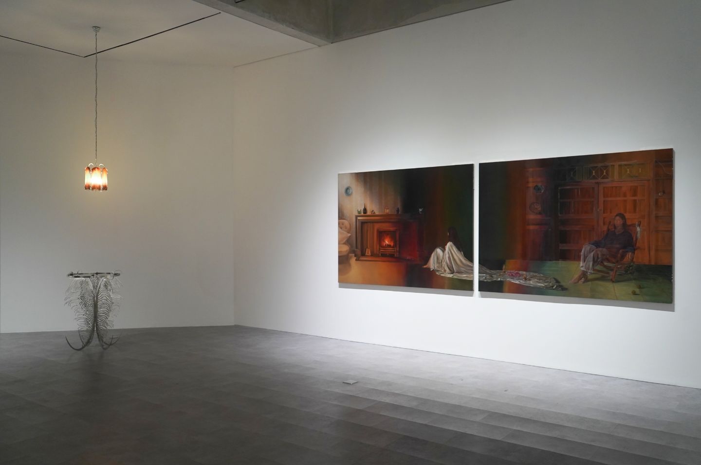 Under industrial lighting, the exhibition is experienced through the light of fire—a non-neutral, unstable illumination that never evenly reveals everything. Fire emits warmth and often signifies renewal, yet it also carries the potential for immense destruction, an elemental force that oscillates between care and annihilation, between life and death, between birth and decay. Across her works, shadows lurk in its flicker and enigma.