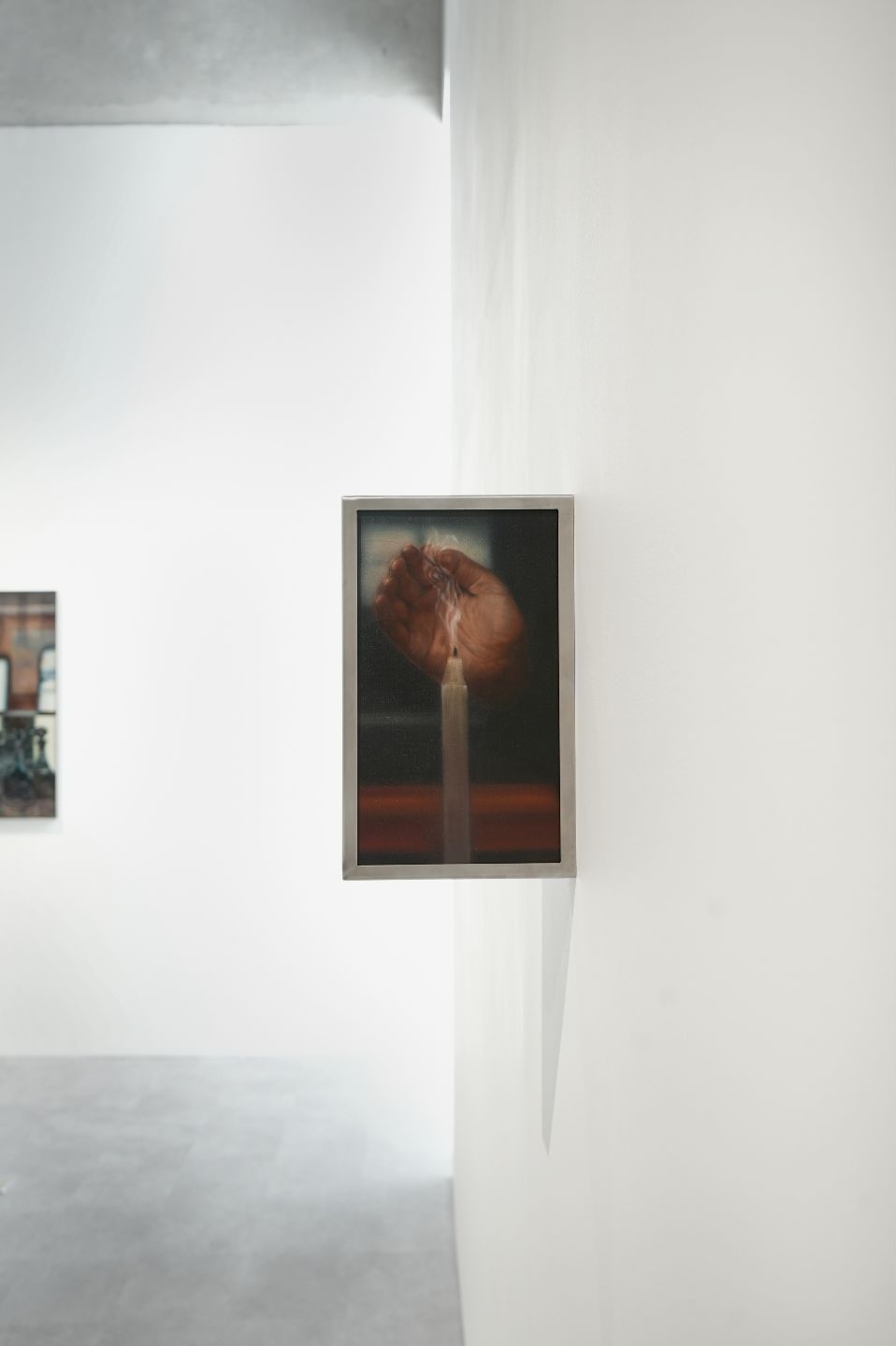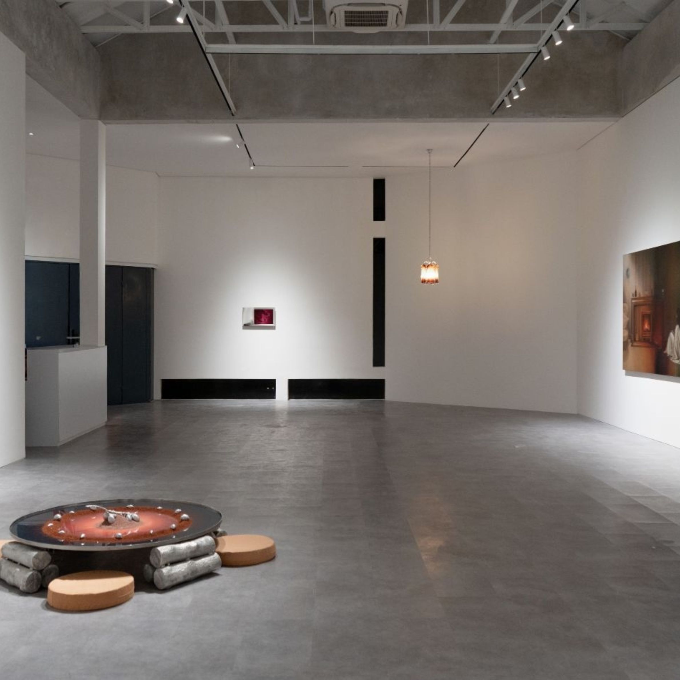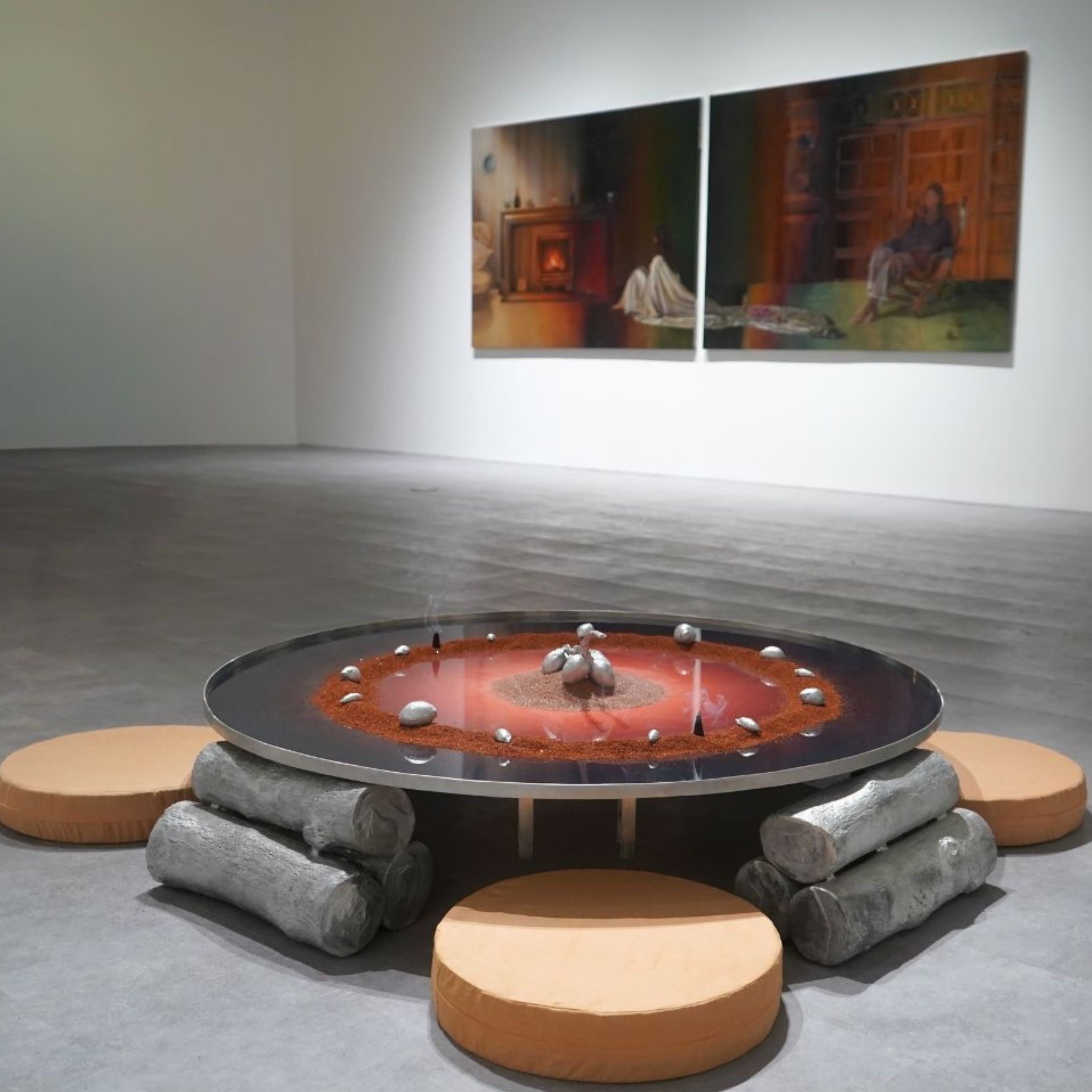 Under industrial lighting, the exhibition is experienced through the light of fire—a non-neutral, unstable illumination that never evenly reveals everything. Fire emits warmth and often signifies renewal, yet it also carries the potential for immense destruction, an elemental force that oscillates between care and annihilation, between life and death, between birth and decay. Across her works, shadows lurk in its flicker and enigma.