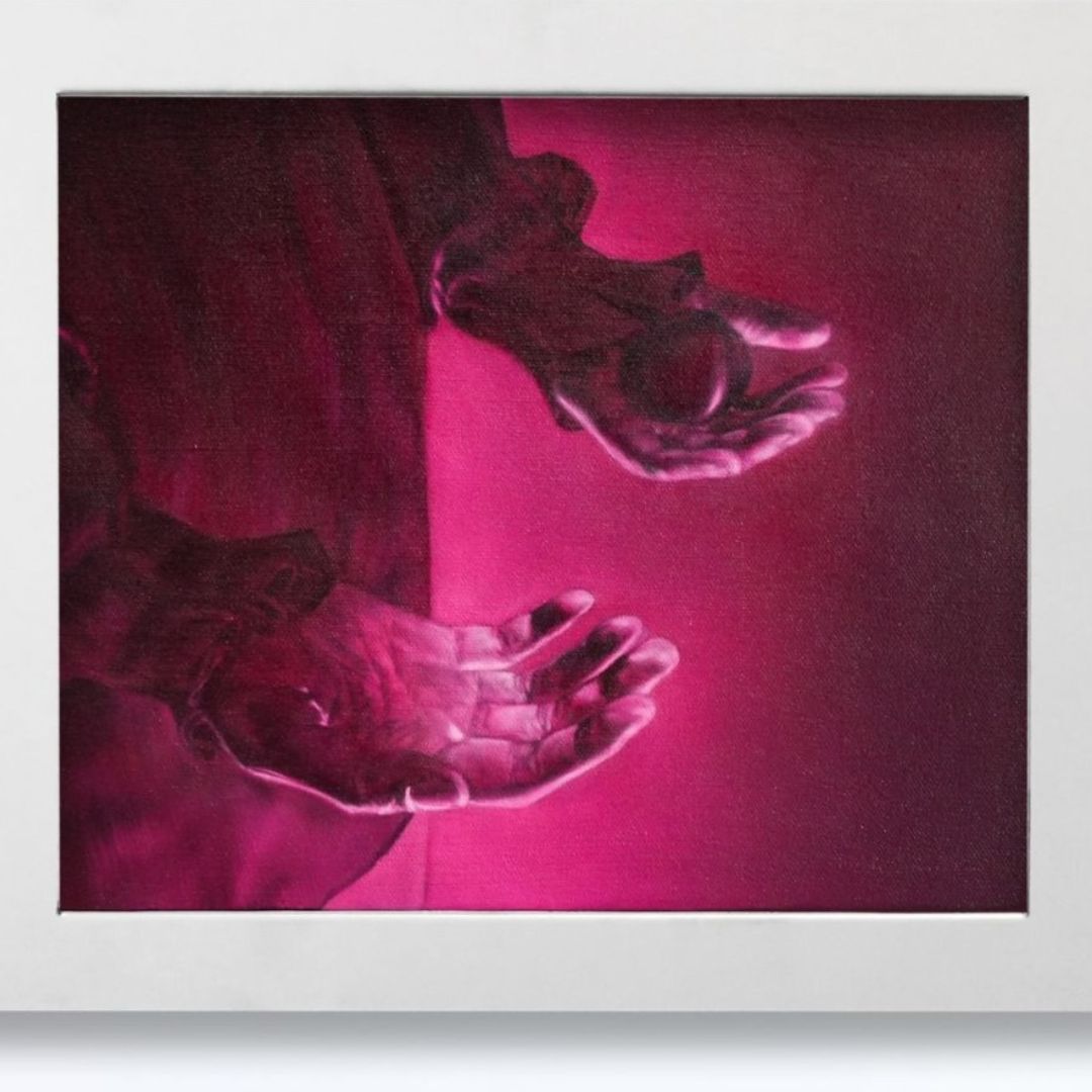 2026, oil on canvas and stainless steel frame, 71 x 48 x 6 cm (framed)