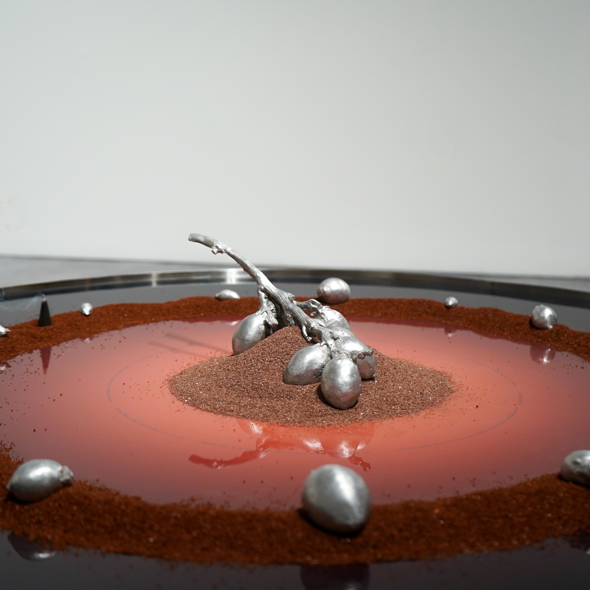 Betel nut is not simply a recurring motif but the central material and symbolic axis of Natalie's new body of work, one of the most charged symbols running through her practice. Throughout the exhibition, betel nut returns insistently, binding together questions of the body, feminist kinship and postcolonial condition in Thailand. Across Southeast Asia, betel chewing has long operated as a social and ceremonial medium; the act of chewing betel nut together functions as a gesture of hospitality to welcome guests into the household or offered as gifts in weddings or rituals, but also as a form of mild stimulation that sends a subtle chill through the body, a sensation that cuts through the stillness of midday. From the late 19th century, during the reign of King Rama V, the practice was gradually displaced by imported ideals of modernity bound up with hygiene and civility, culminating in state-led campaigns in 1940s Thailand to suppress it. Betel stains the teeth, reddens the saliva, trains the mouth, and seeps into the body. Long condemned as vulgar or backward, it undergoes an alchemy here, recast in silver aluminium and given weight in what becomes Natalie's own rituals.